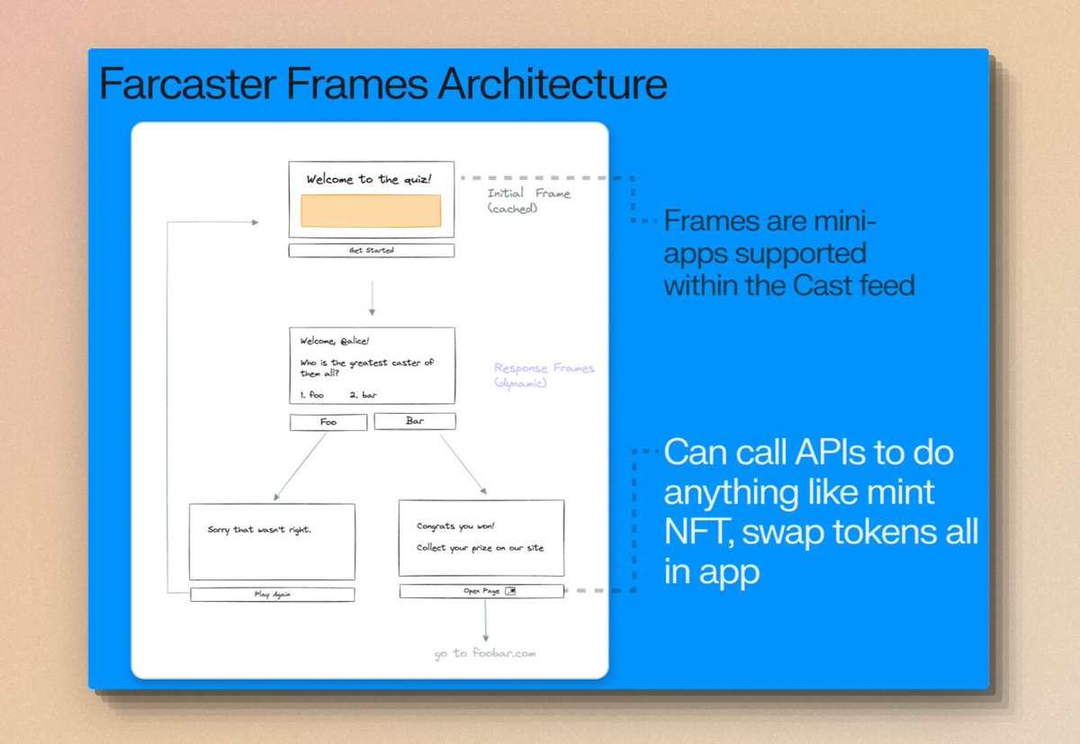Frames 本质上是一种在 Farcaster 帖子中嵌入的小型应用程序,它们使得帖子不仅仅是静态内容的展示,而是可以成为交互式的平台。用户可以直接在社交媒体交互中访问各种功能和服务,无需离开 Farcaster 平台。