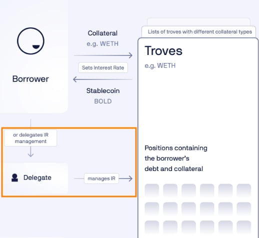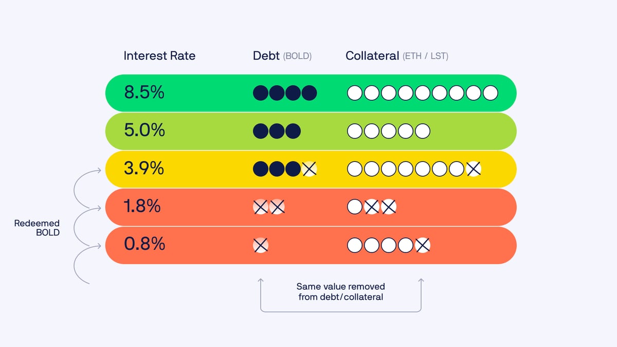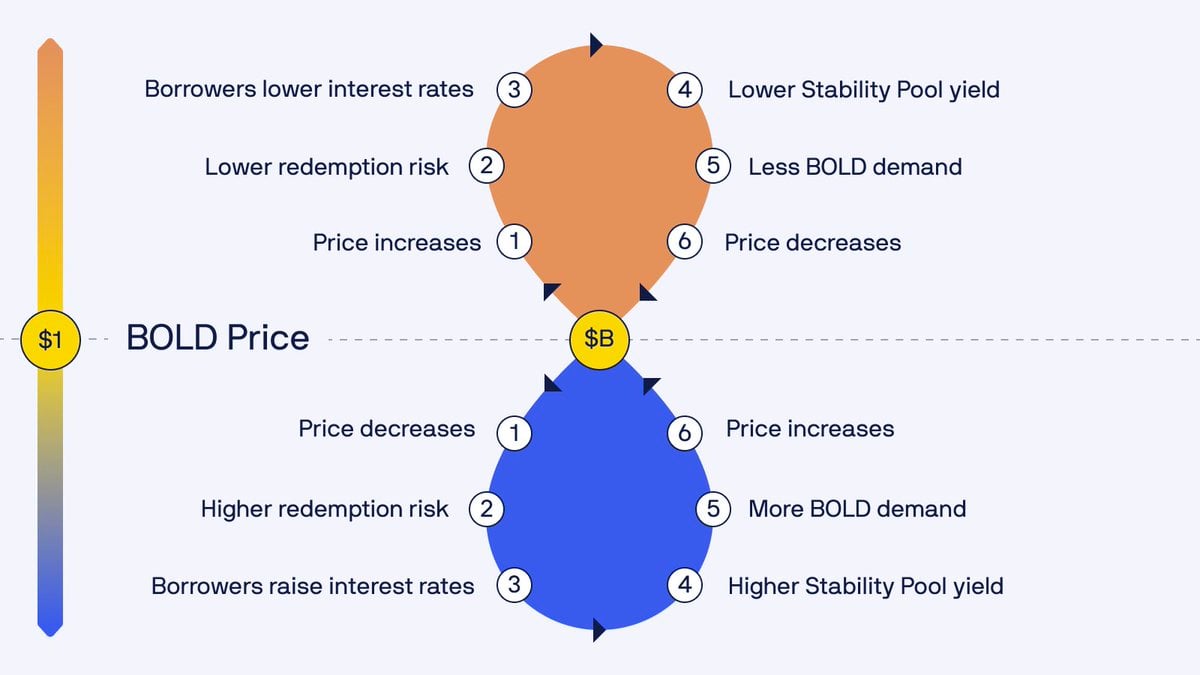 当 BOLD 价格低于1美元时,赎回风险上升,借款人倾向于提高利率以吸引更多 BOLD 存款,推高 BOLD 价格,因为当 BOLD 低于1美金出现套利空间时,会催动套利者将BOLD赎回为抵押品出售,而这种潜在的赎回风险会率先赎回利率低的贷款。反之当 BOLD 高于1美元时,借款人可以相对安全地降低利率。这一机制有助于稳定 BOLD 币价,同时提供利率的充分博弈。