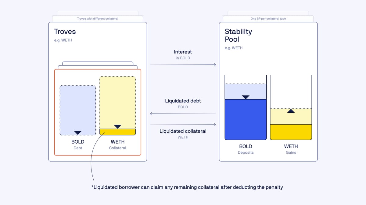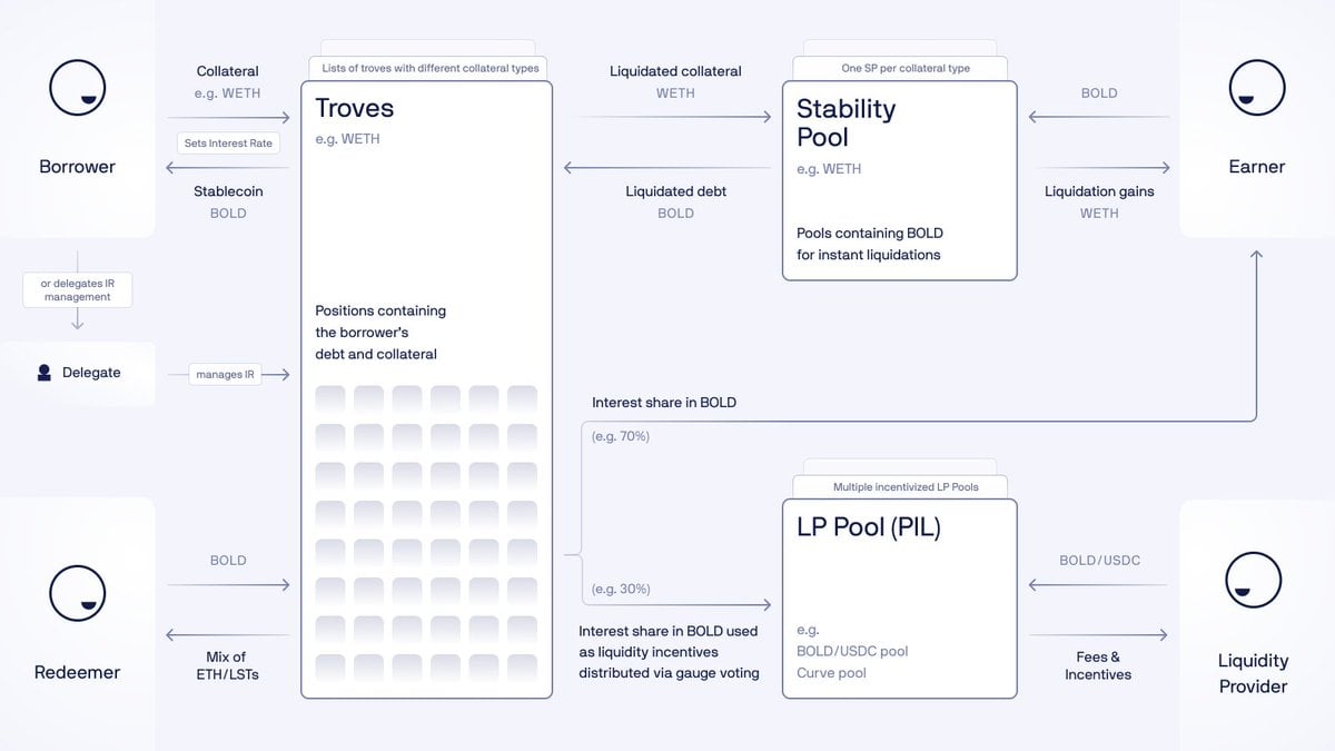 在 Liquity 协议中,无论是 v1 的 LUSD 还是 v2 的 BOLD,都有一个重要的机制叫做赎回(Redemption)。当 BOLD 的市场价格低于 1 美元时,任何 BOLD 持有者都可以通过协议,按照 1:1 的比例,将 BOLD 兑换为等值的抵押品(如 ETH)。这个过程实际上是 BOLD 持有者直接购买借款人抵押品的过程。 对于 BOLD 持有者来说,这是一个套利的机会:他们可以在市场上以低于 1 美元的价格购买 BOLD,然后通过协议赎回,获得等值的 ETH,从而获利。这个操作会增加 BOLD 的需求,推动其价格回到 1 美元附近。