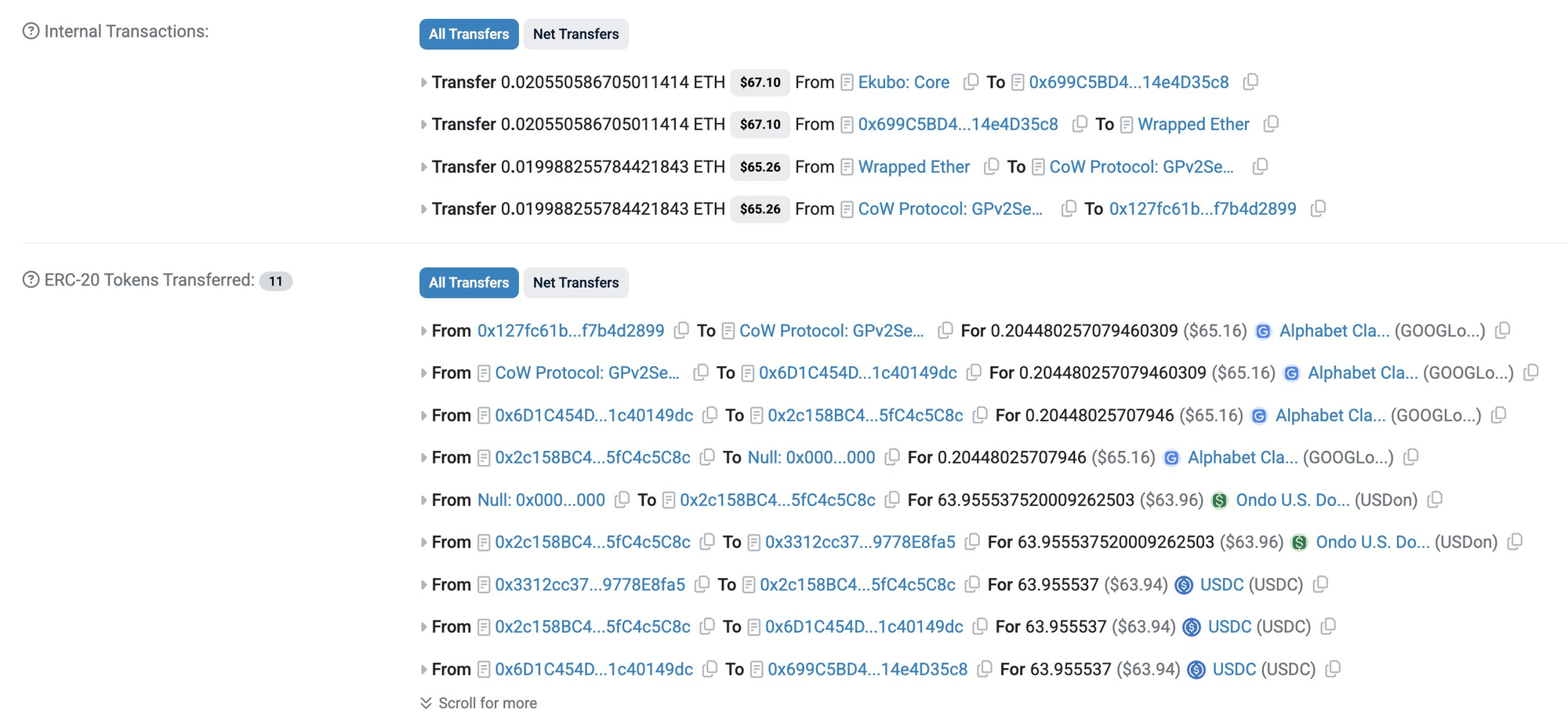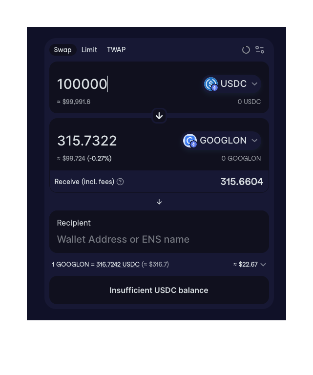 目前Ondo Finance Global Markets是需要申请且通过KYC认证的,有国家和地区的限制,而目前似乎cowswap集成了Ondo的这一市场,那么理论上它实现了绕开KYC自由交易自由流通,虽然这在未来可能引发监管关注,但目前极大的降低了进入门槛,基本实现了全球用户低成本的购买美股代币。